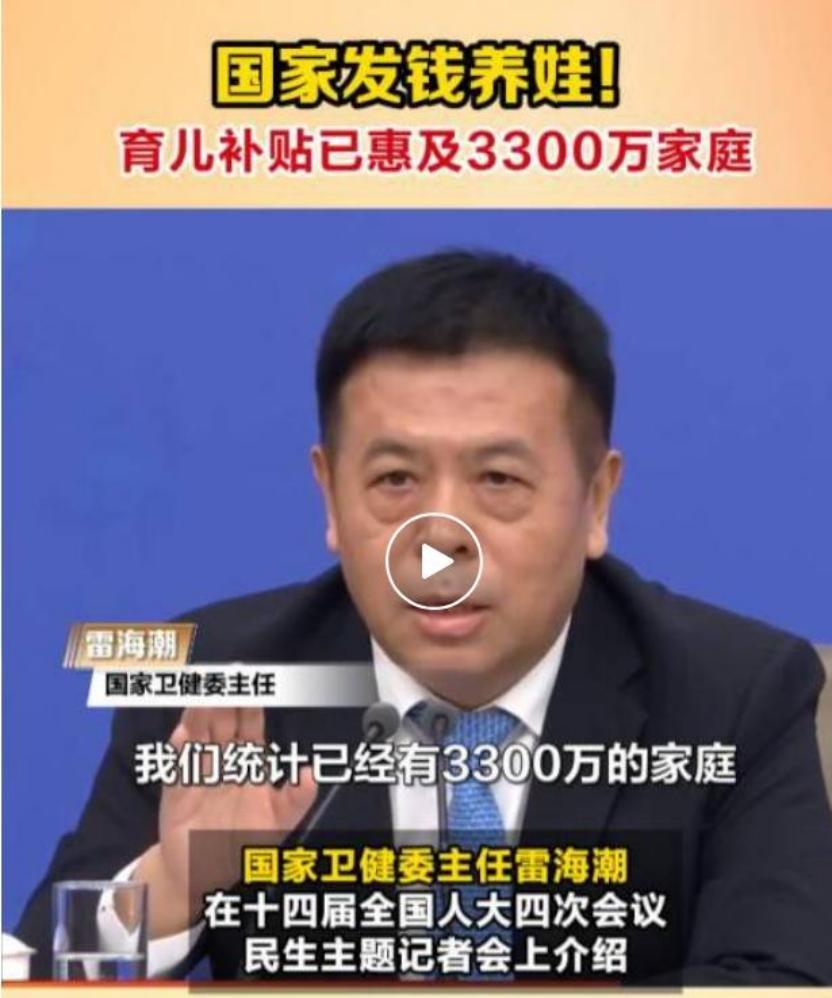 在3月7日十四届全国人大四次会议举行民生主题记者会上,卫健委主任雷海潮向记者介绍了育儿补贴政策。截至目前,已经有3300万家庭领到育儿补贴,老百姓形象地形容该政策为“孩子一出生就自带口粮,自带工资”。