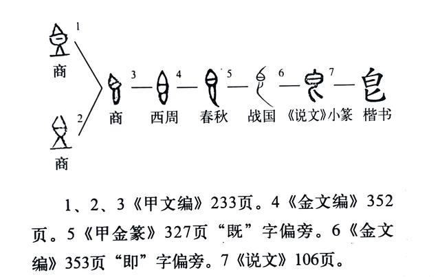 皀是象形字,像食器形。其最早见于殷商卜辞,像谷物盛于簋中之形。初文主体像有圈足的簋(字形1),尖顶像满盈高出的谷物。同时,字形中字头这个尖顶与可以同象形的“豆”字相区别。到了殷商后期,书写变简,原平底圈足形变作向下的窄弧形,经西周,至春秋渐变,战国又变,至小篆变作斜下双歧的“匕”形。是以《说文》说:“匕所以扱之”。“扱”在这里读xī,收取、取;有闻到谷物之香或盛装谷物义。