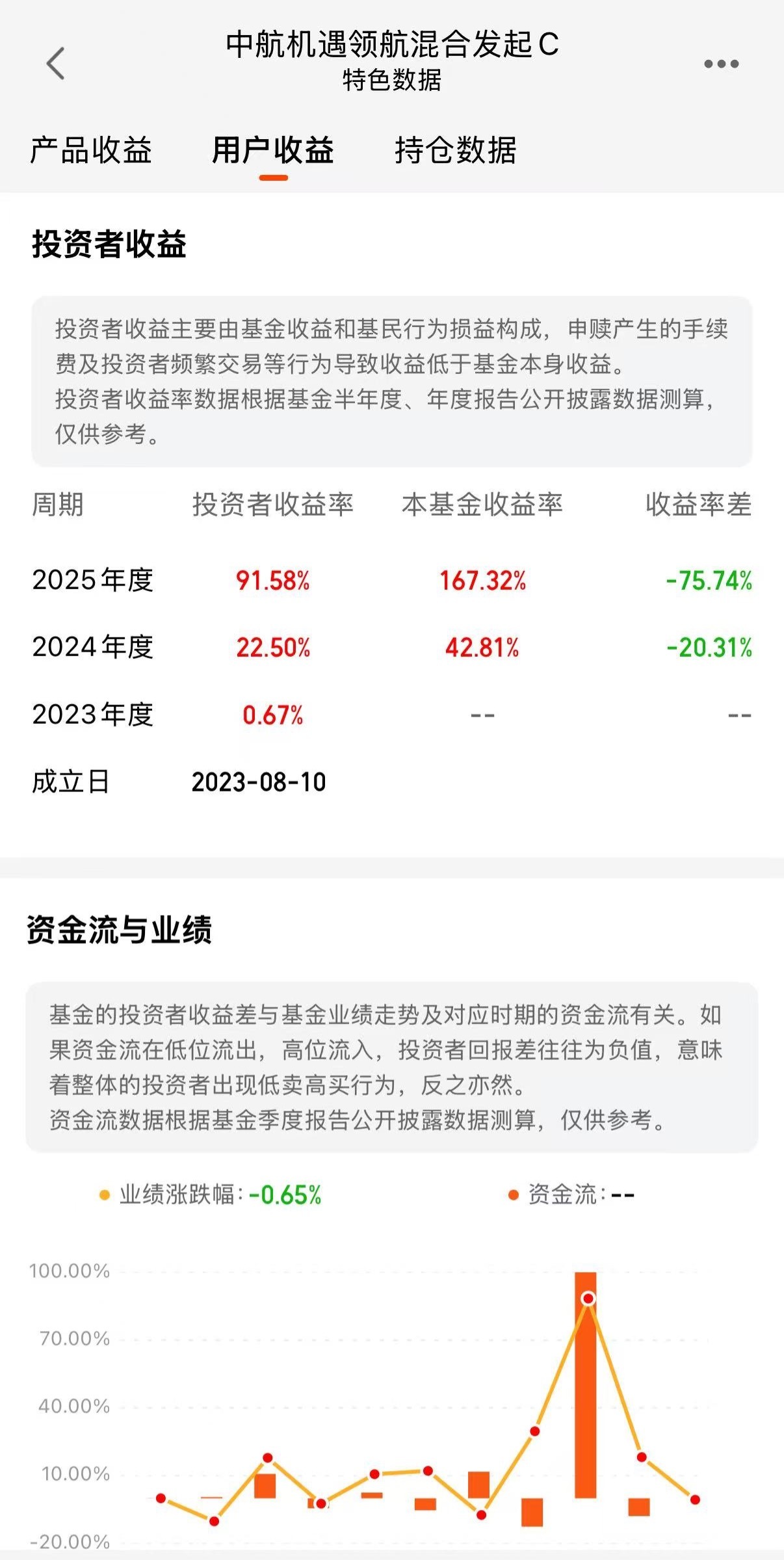在用户收益页面下方,天天基金还披露了资金流与业绩项。