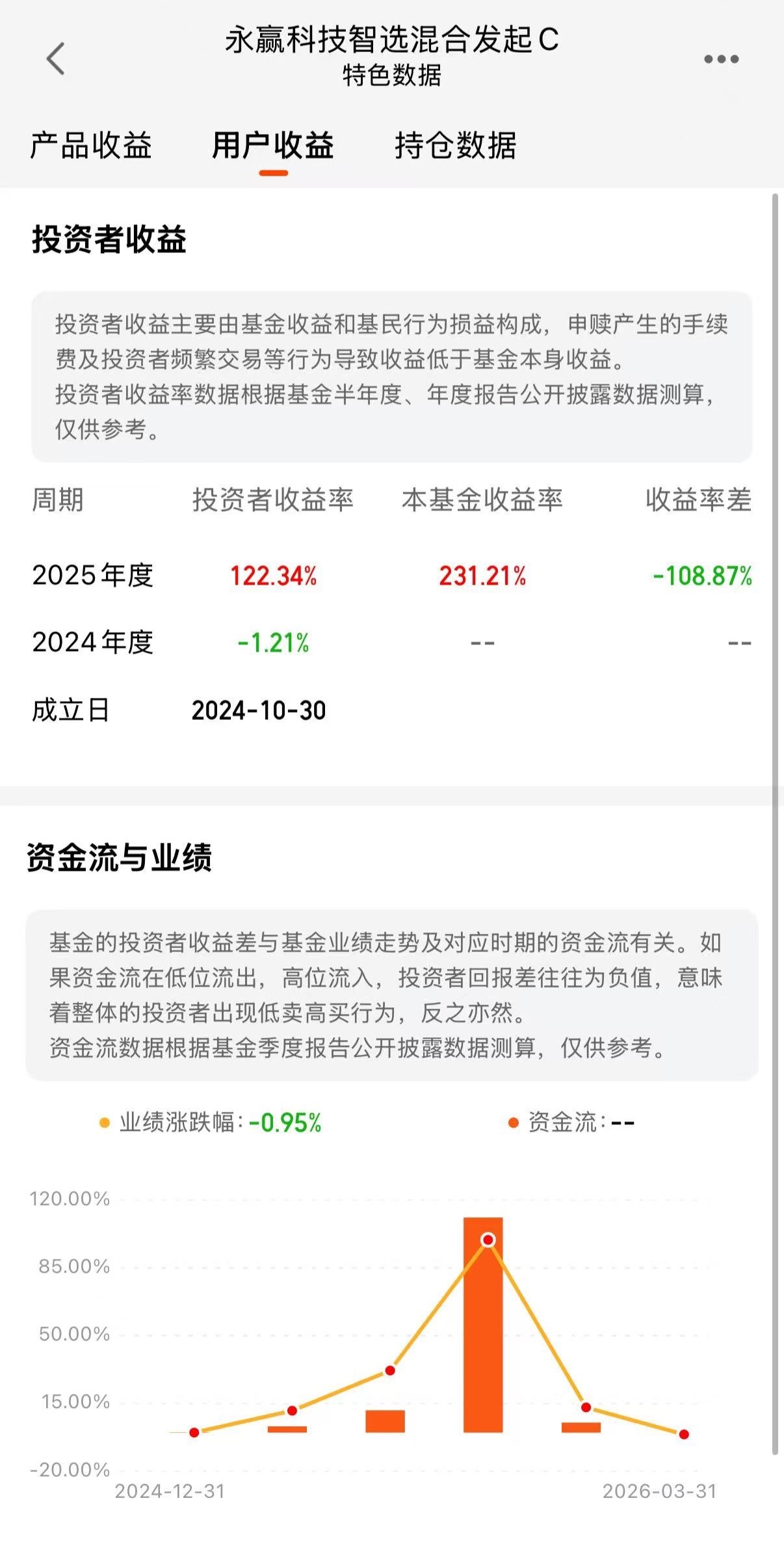 据天天基金披露,“投资者收益主要由基金收益和基民行为损益构成,申赎产生的手续费及投资者频繁交易等行为导致收益低于基金本身收益。投资者收益率数据则根据基金半年度、年度报告公开披露数据测算,仅供参考”。