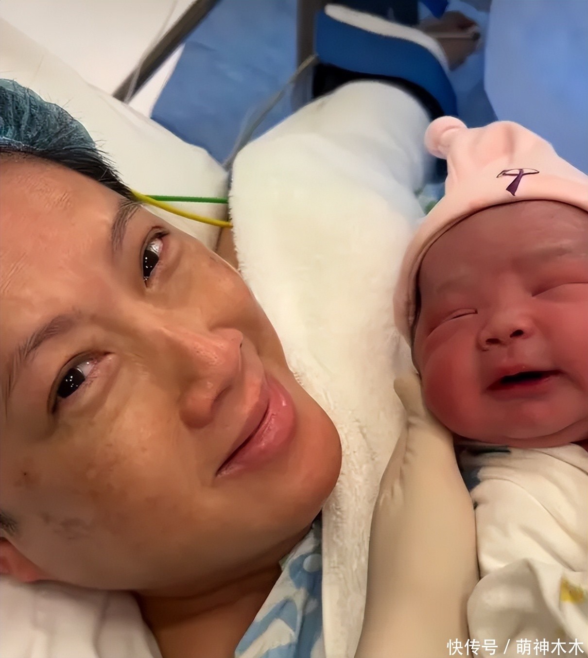 照片中58岁的陈丽丽躺在床上,脸色虽然有些疲惫,但却眼眶发红,满眼泪水,胸前还躺着刚出生的女儿,心情看起来很激动。